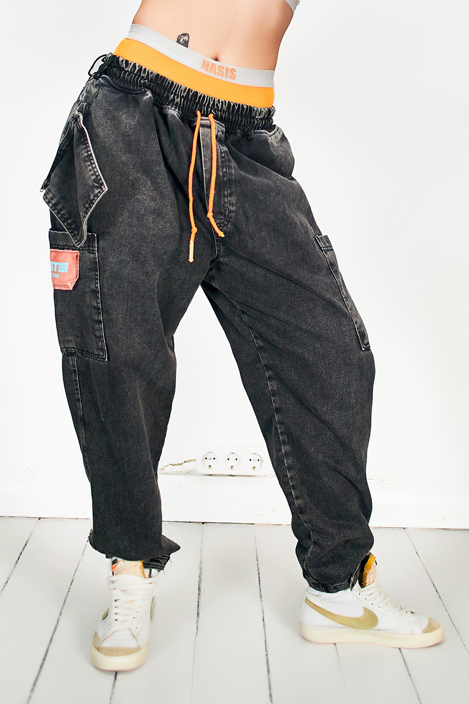 Джинсові штани карго вільного крою оверсайз. 100% бавовна. Технологія обробки джинсу Stone Wash. Пояс на резинці. 2 задніх та 2 бокових кармана. На резинці та шнурку